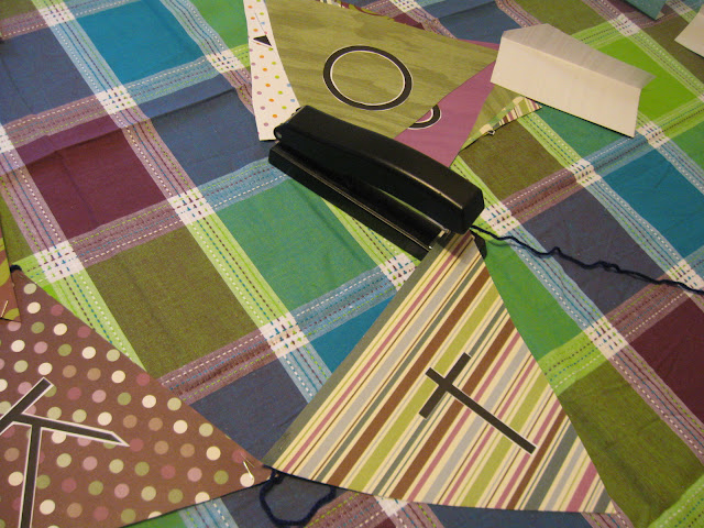 Next I grabbed some yarn and stapled them on my triangles to make my banner.