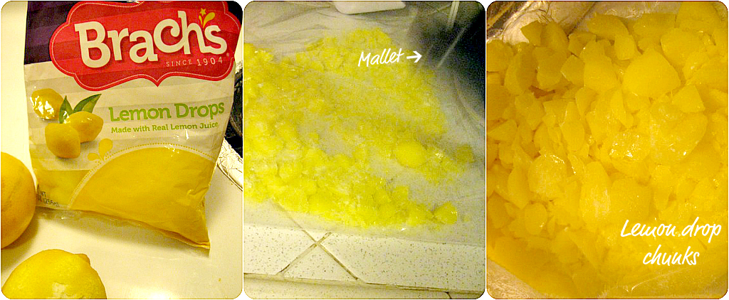 Another step tells you to mash up the lemon drops. I got out my lemon drops, put them in a ziplock bag, then did one hammer with my mallet. Immediately my husband was at my side, eagar to mash up some lemon drops. He thought that was quite fun.