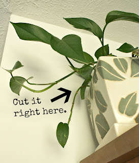 My next step was to add my new plant. I have a philodendron plant, which had one sections sticking out all crazy. I decided to cut it off and replant it in my jar with water.