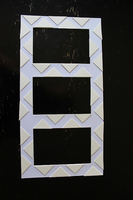 The next day, using tacky craft glue, I painted the glue on the back of each triangle and placed it on the mat. I wanted the glue to go on evenly and to each edge, thus the use of the paint brush.